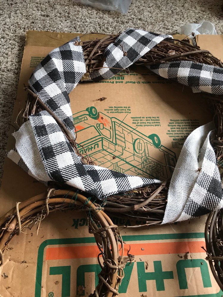 Once I wrapped it around like I wanted, I cut the ribbon and hot glued the excess behind the wreath. It doesn’t have to be pretty, no one will see the back of it!